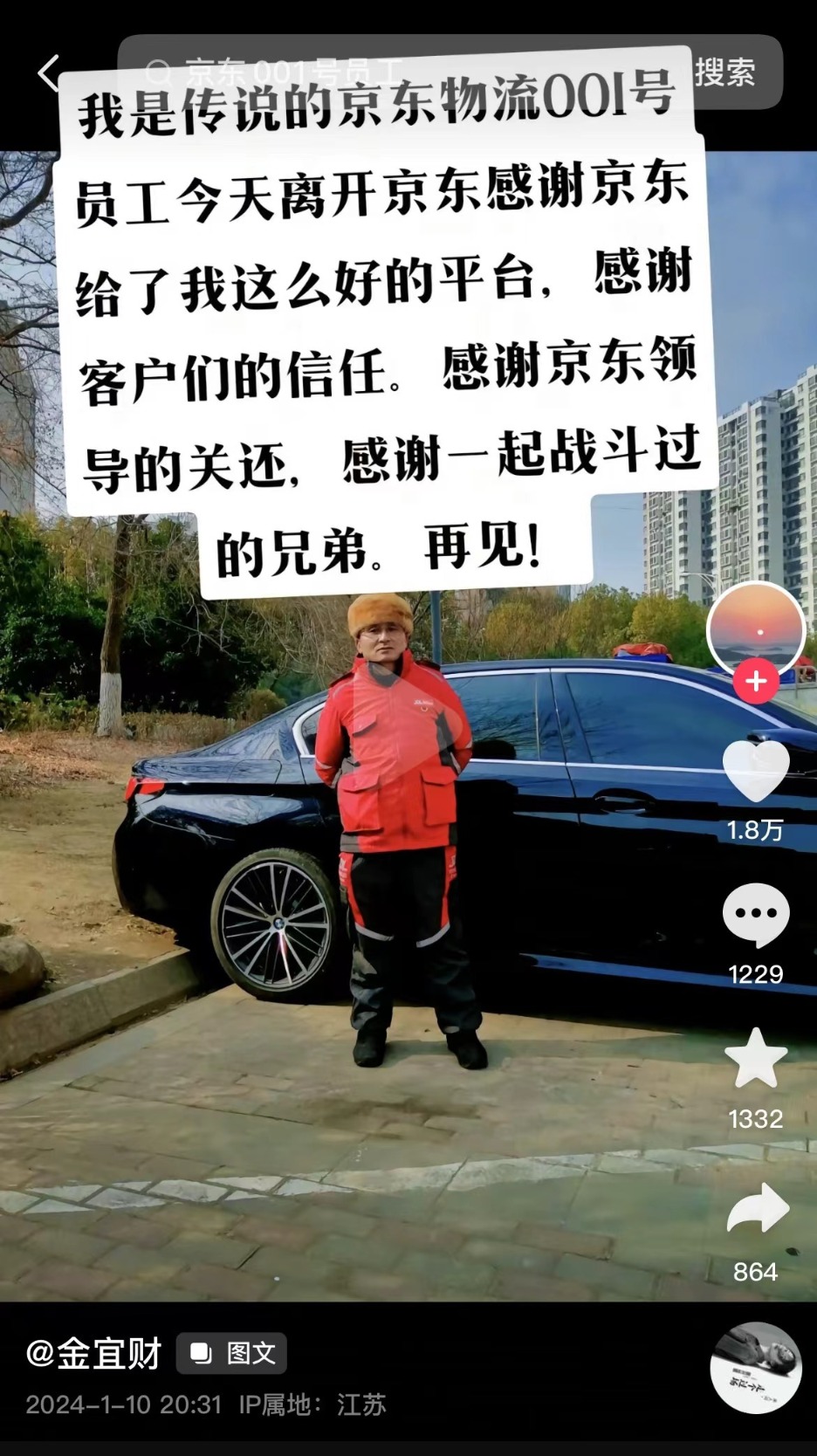 金宜财于1月10日晚在社交平台发文称,“我是传说的京东物流OO1号员工,今天离开京东,感谢京东给了我这么好的平台,感谢客户们的信任。感谢京东领导的关还,感谢一起战斗过的兄弟。再见!”