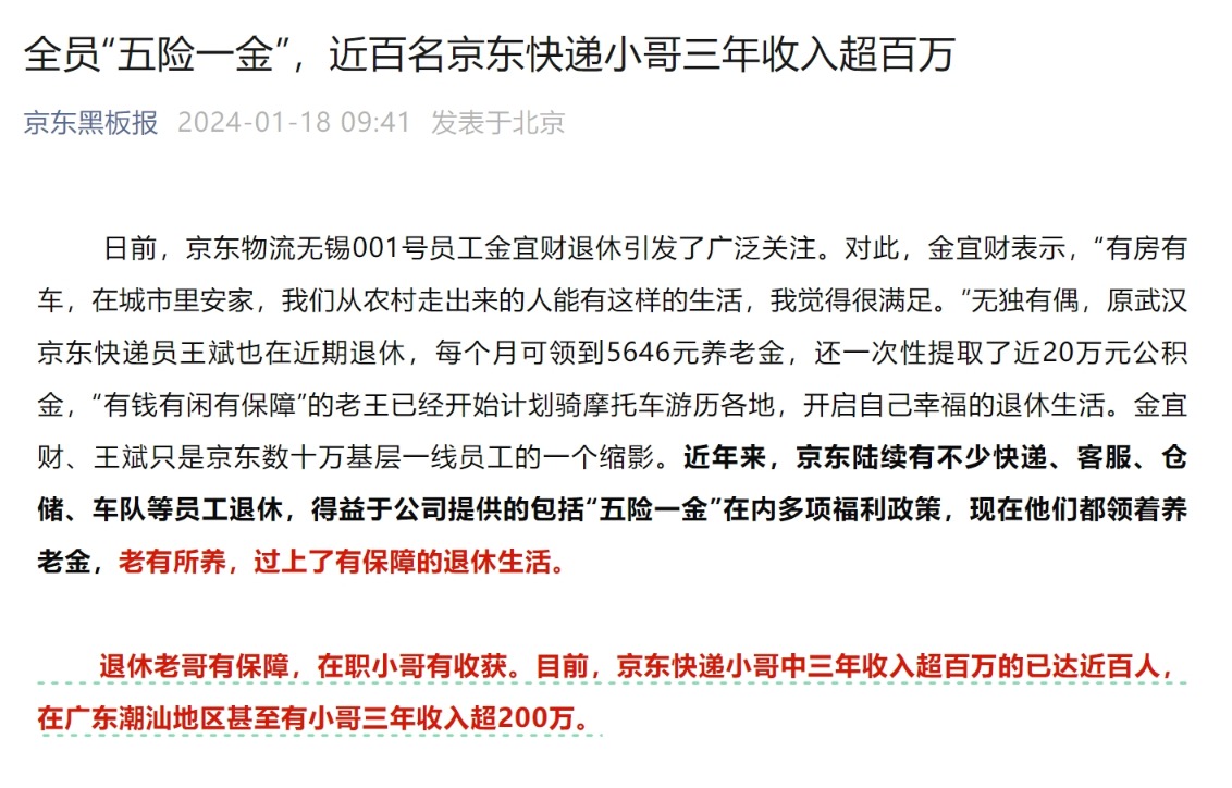 京东回应表示:“近年来,京东陆续有不少快递、客服、仓储、车队等员工退休,得益于公司提供的包括‘五险一金’在内多项福利政策,现在他们都领着养老金,老有所养,过上了有保障的退休生活。”