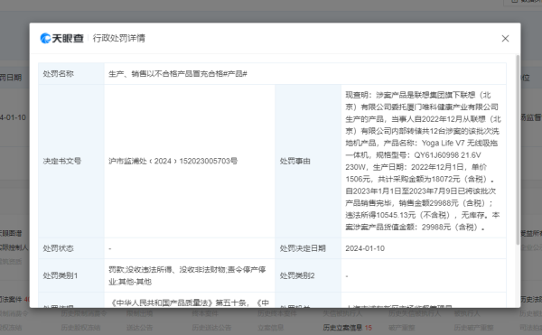 处罚信息显示,涉案产品是联想集团有限公司(下称“联想集团”)旗下联想(北京)有限公司委托厦门唯科健康产业有限公司生产的产品。2023年7月,在上海市监局组织的洗地机产品质量监督抽查中,由当事人销售的名为“Yoga Life V7无线吸拖一体机”的洗地机产品经抽样检测,“结构(不测 22.46 条)”项目不符合要求,被判定为不合格。当事人内部转储共12台涉案产品,销售金额2.9万余元,违法所得1万余元。