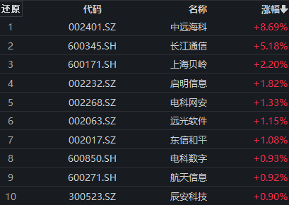 此外,其他央企改革相关指数中,中证国新央企科技引领指数(932038)早盘小幅下跌,成分股跌多涨少。上涨个股中,中远海科涨近9%,长江通信涨超5%,上海贝岭、启明信息、电科网安、远光软件、东信和平、电科数字、航天信息、辰安科技等上涨。