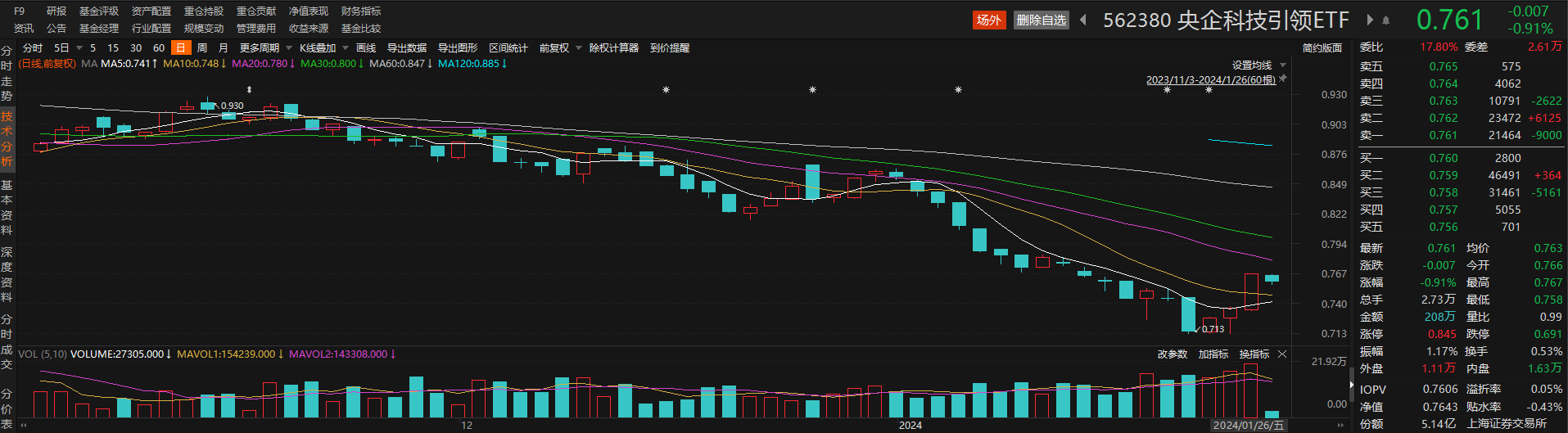 跟踪中证国新央企科技引领指数的央企科技引领ETF(562380)跌近1%,但盘中现小幅溢价。截至发稿,该ETF下跌0.91%,溢折率为0.07%。