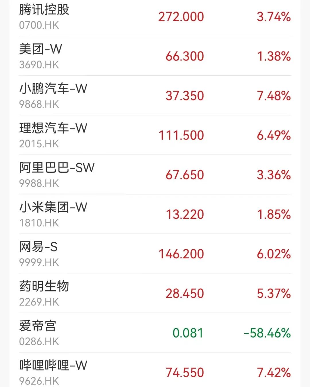 盘面上,大型科技股涨势如虹,网易涨6%,腾讯、阿里巴巴、百度涨超3%,美团、小米集团涨超1%;大金融股、中字头股等权重全线拉升,招商银行一度涨超7%,中国平安、中金公司等纷纷上涨;内房股涨幅较大,龙湖集团涨超9%领衔;医药股纷纷上扬,康诺亚涨近6%,药明生物涨超5%;游戏股表现强势。