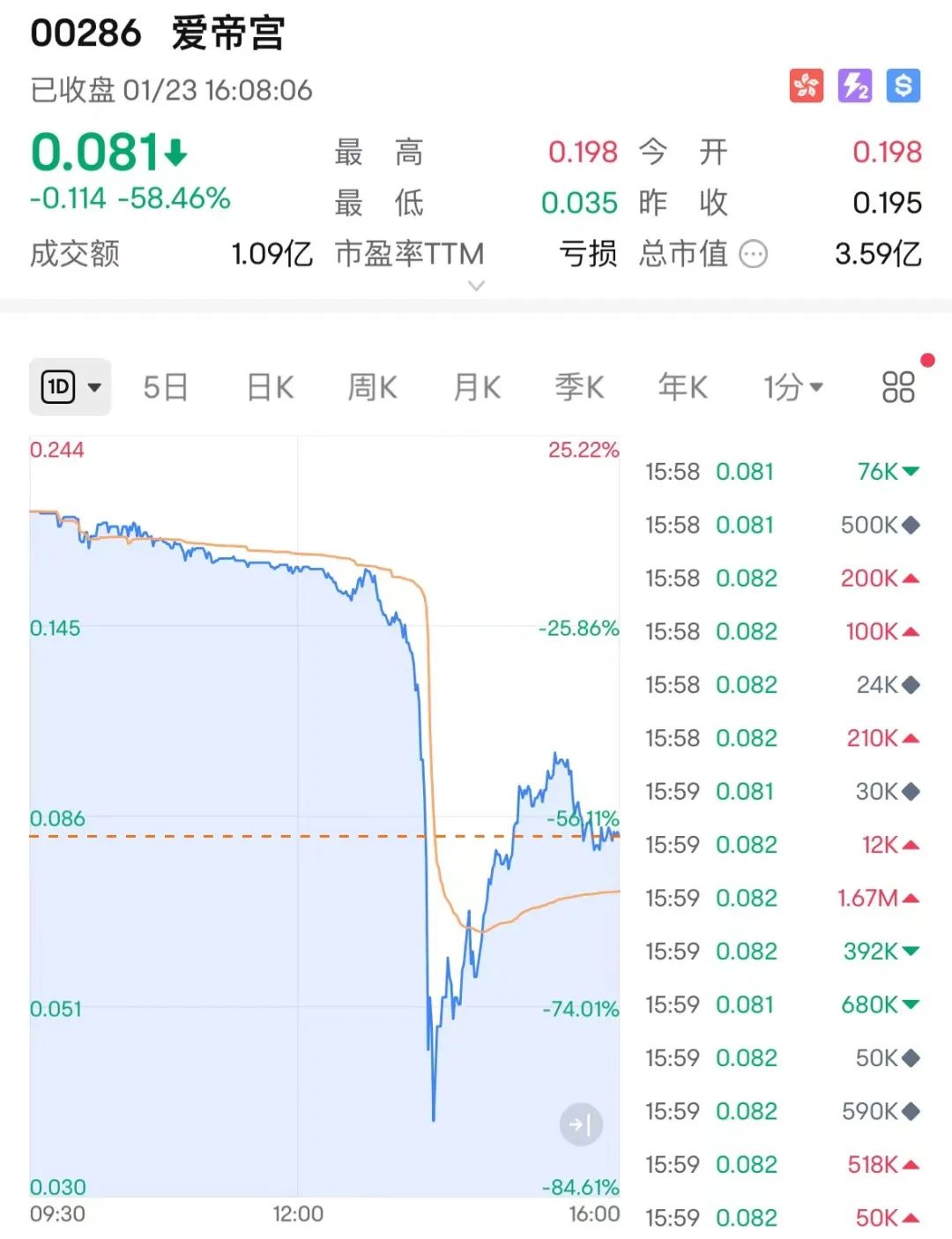 1月23日,港股市场“月子中心第一股”爱帝宫盘中闪崩,一度跌近82%,收跌58.46%,报0.081港元/股,成交额1.09亿港元,总市值3.59亿港元。