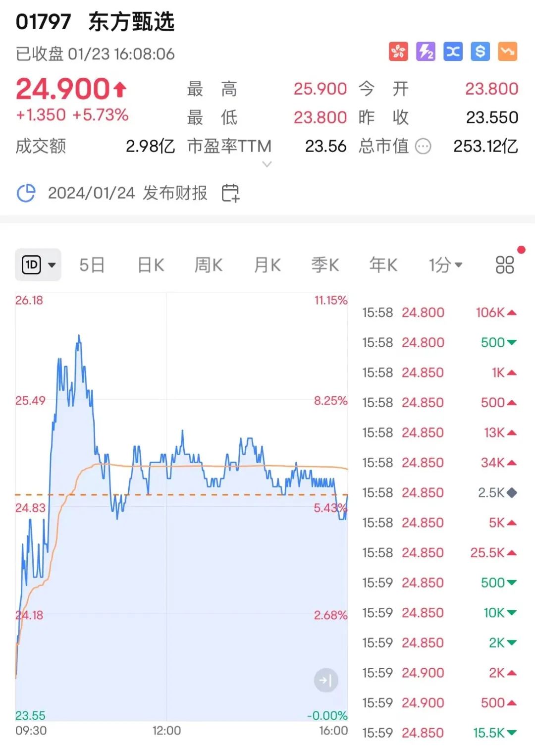 1月23日,东方甄选大涨近6%,报24.9港元/股,最新总市值253.12亿港元。