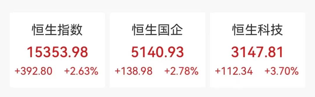 1月23日,港股三大指数大反攻,恒生科技指数盘中一度大涨5.2%,恒指上扬近400点重回15000关口上方。截至收盘,恒生指数报15353.98点,上涨2.63%;恒生国企指数报5140.93点,上涨2.78%;恒生科技指数报3147.81点,上涨3.7%。