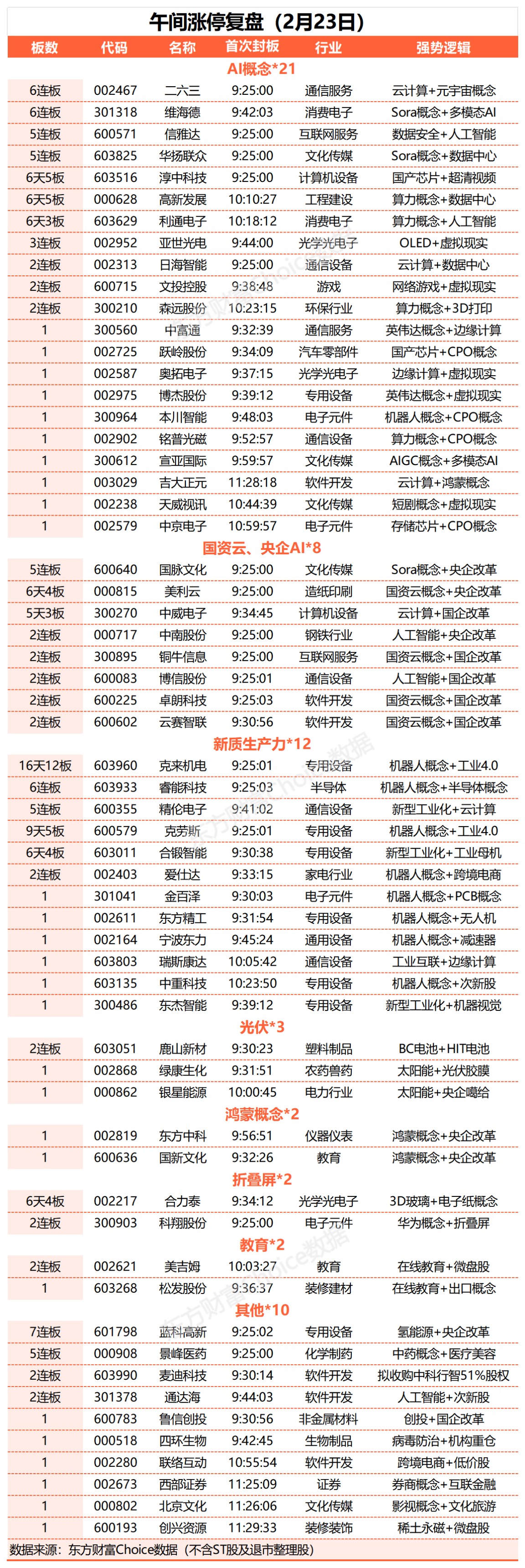 个股方面, AI概念股持续活跃,其中Sora及短剧概念股领涨,维海德20CM6连板,国脉文化、天威视讯涨停;英伟达概念股开盘拉升,中富通、博杰股份、利通电子、卓朗科技等涨停;CPO概念股盘中异动,瑞斯康达、铭普光磁涨停;算力概念股维持强势,铜牛信息、高新发展、云赛智联等涨停;券商股临近上午收盘前异动,西部证券涨停。下跌方面,旅游股陷入调整,长白山跌近5%。