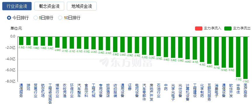净流出方面,医疗服务、半导体等排名靠前,其中医疗服务净流出7.5亿元。