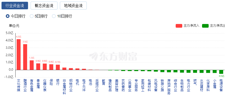 行业资金方面,截至午间收盘,文化传媒、酿酒等净流入排名靠前,其中文化传媒净流入4.2亿元。