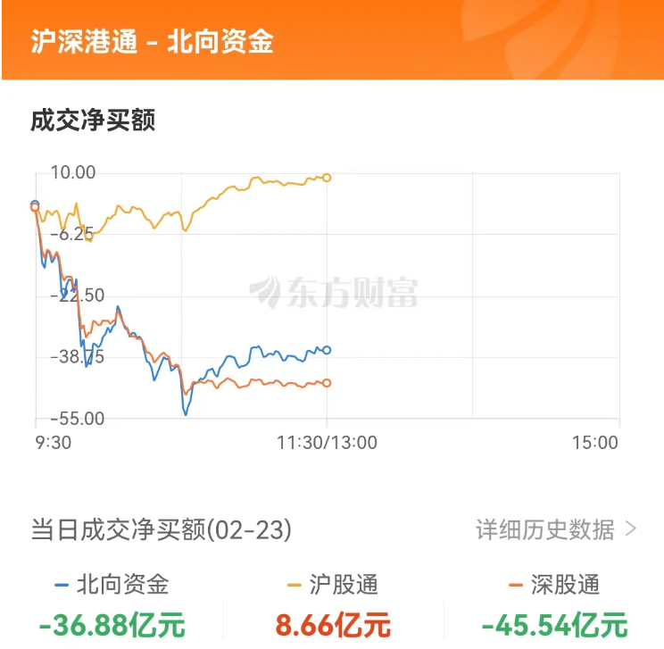 截至午间收盘,北向资金净流出,其中沪股通净流入8.66亿元,深股通净流出45.54亿元,合计净流出36.88亿元。