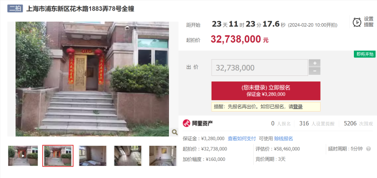 上海市浦东新区花木路1883弄78号全幢,建筑面积355.25平方米,花园住宅,评估价5846万元,起拍价3273.8万元,保证金328万元,增价幅度16万元及其倍数。目前已有5000多人次围观,300多人设置提醒,将于2月20日开拍。