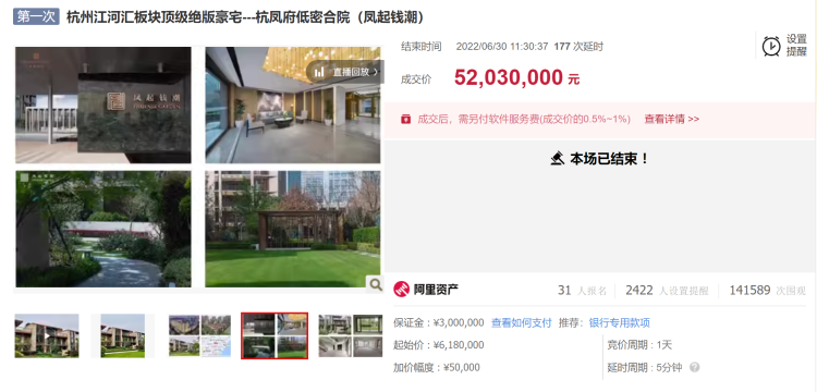 基于阿里资产的平台优势,全国已有多个高端住宅溢价成交。比如厦门鼓浪屿稀缺别墅曾家园,起拍价为618万元,起拍单价约2.21万元/平方米。曾家园是鼓浪屿仅剩不多的可交易的带庭院独栋百年别墅,极具稀缺性和收藏价值。于去年7月15日上午10时起开始进入拍卖流程,原定于7月16日10点结束,由于不断有买家进场,拍卖经过129次延时,于7月16日13点08分才结束,整个拍卖历时27个小时,围观人数也创下拍卖新高。最终曾家园别墅吸引了23位买家,超8万人围观,238轮竞价,以总价2903万元成交,溢价率高达469.74%,成交单价103645元/平方米。