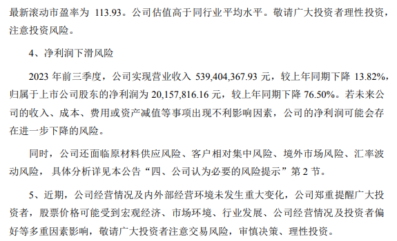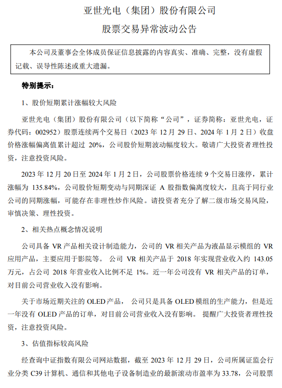 亚世光电1月2日公告,12月20日至2024年1月2日,公司股票价格连续9个交易日涨停,累计涨幅为135.84%,公司股价短期变动与同期深证A股指数偏离度较大,且高于同行业公司的同期涨幅,可能存在非理性炒作风险。