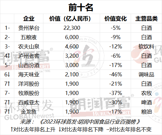 根据榜单,贵州茅台以2.2万亿价值蝉联中国食品行业最具价值企业,比去年下降5%。五粮液价值下跌9%,以6000亿元位居第二。钟睒睒的农夫山泉以4600亿元价值位居前三,虽然比去年下降12%,仍然是价值最高的软饮企业。