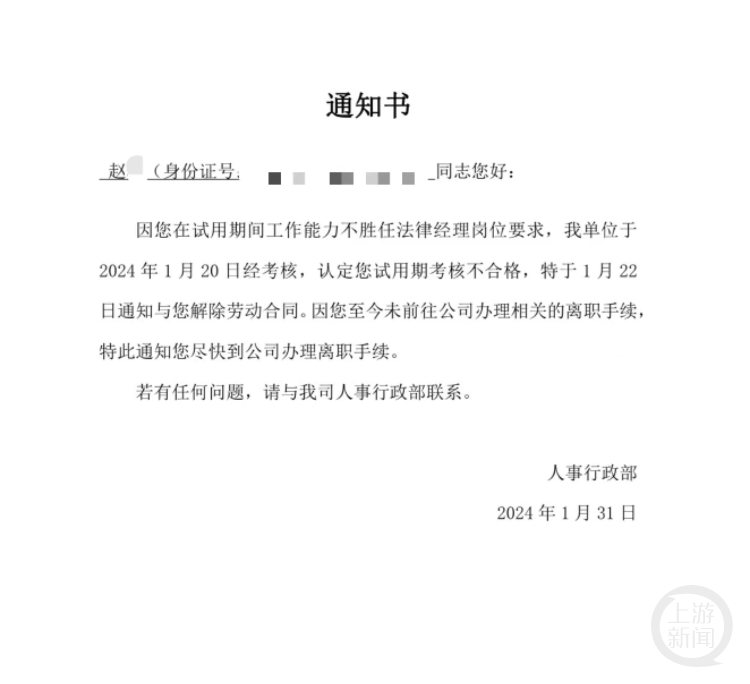 1月31日,赵先生终于收到了公司HR的邮件,“因在试用期间工作能力不胜任法律经理岗位要求而被解除合同。”他告诉记者,“有这个邮件我的证据链就齐了。”